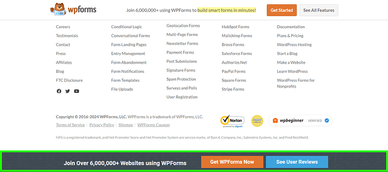 O WPForms é um plugin que facilita a construção e implementação de formulários dentro de sites feitos em WordPress. Na barra fixa eles colocaram dois CTAs: um para adquirir o plugin e outro direcionando para o review de usuários.