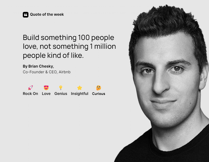 Dentro da seção “frase da semana”, o time de conteúdo queria que fosse possível reagir ao conteúdo (assim como fazemos no Facebook ou LinkedIn, por exemplo) e que, após o leitor clicar em sua reação, aparecesse um gráfico mostrando qual emoção teve mais interações.