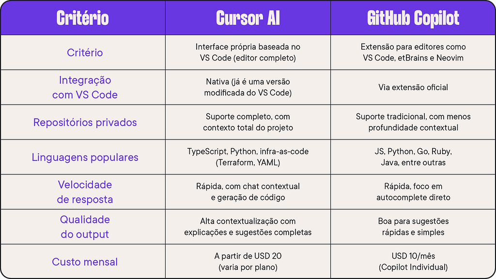 Em suma, para equipes enxutas e que valorizam integração profunda com o código, Cursor oferece vantagens claras. Já para quem busca uma solução leve e econômica, Copilot se mostra mais acessível.