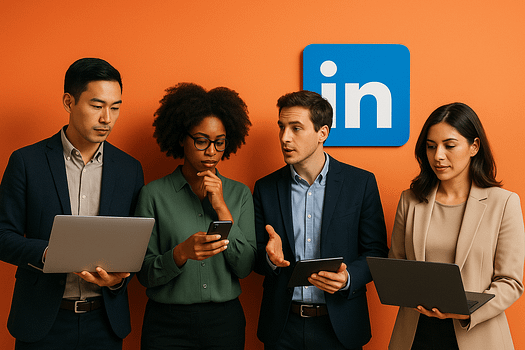 Grupo de profissionais discutindo em frente ao logo do LinkedIn