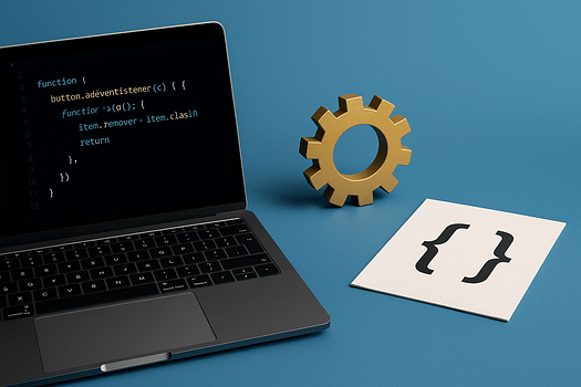 Laptop com código em uma tela e engrenagem decorativa ao lado.