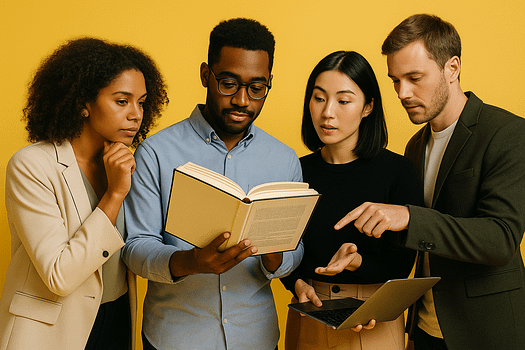 Quatro pessoas lendo e discutindo conteúdo de um livro