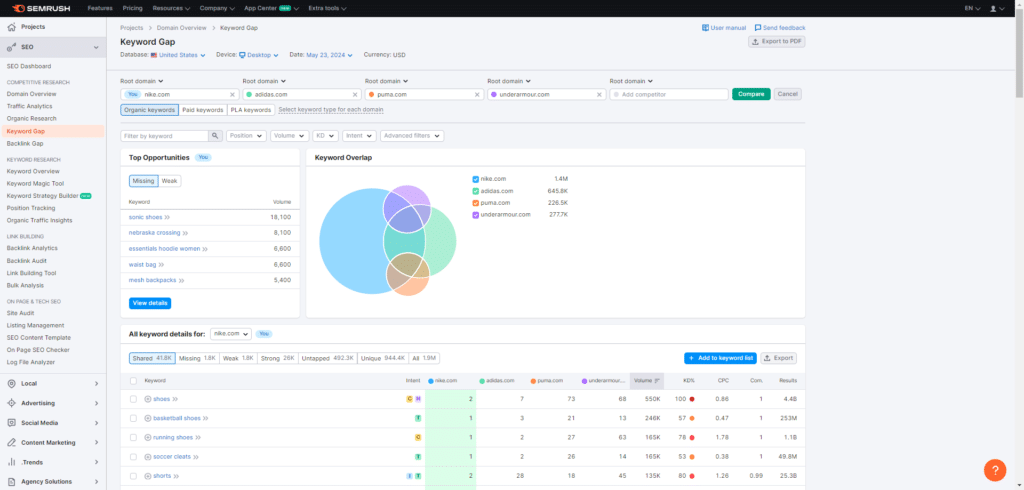 - Keyword Gaps: Identify ‘keyword gaps’—keywords that your competitors are not ranking for but have substantial search volumes. These represent opportunities to capture new audiences.