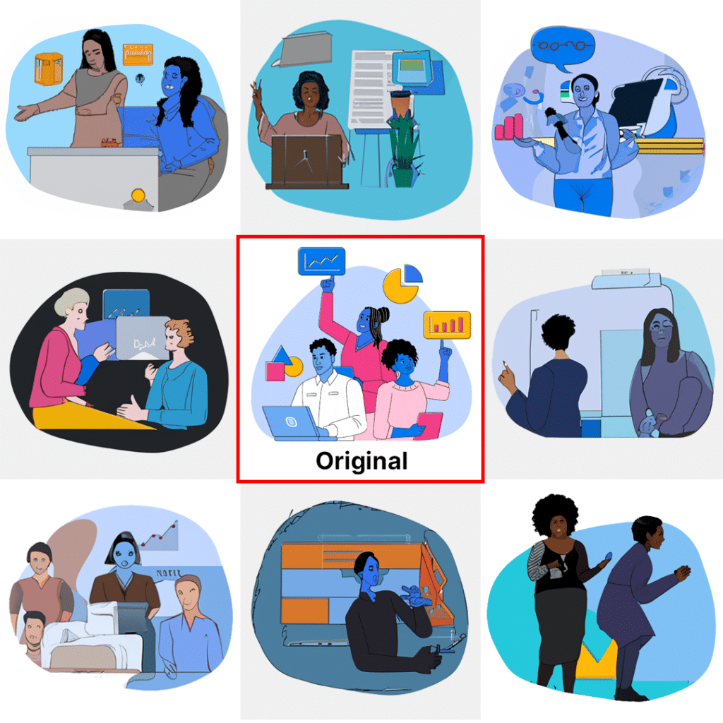 Let’s do one more test so we don’t drag this article out too much. I took an illustration with the unique style we use here at Rock Content. So, I’ve put the illustration on a blank canvas and asked the AI to create a woman doing a presentation with graphics to an audience. And it gave me the following variations: