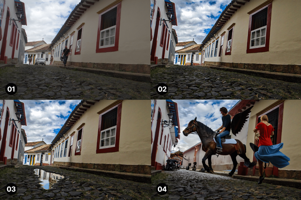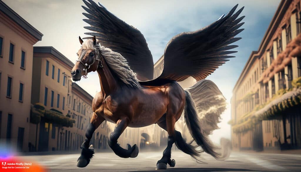 In the third image, I asked the tool to create a water puddle with reflection on the ground. And in the forth image, I pushed the boundaries and asked the AI to put a flying horse in the image. As you can see below, in some cases things worked just fine, but in others it just came out weird, like the horse with a winged guy on its back and the floating riverdancing female figure that came out of nowhere.
