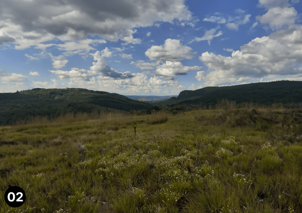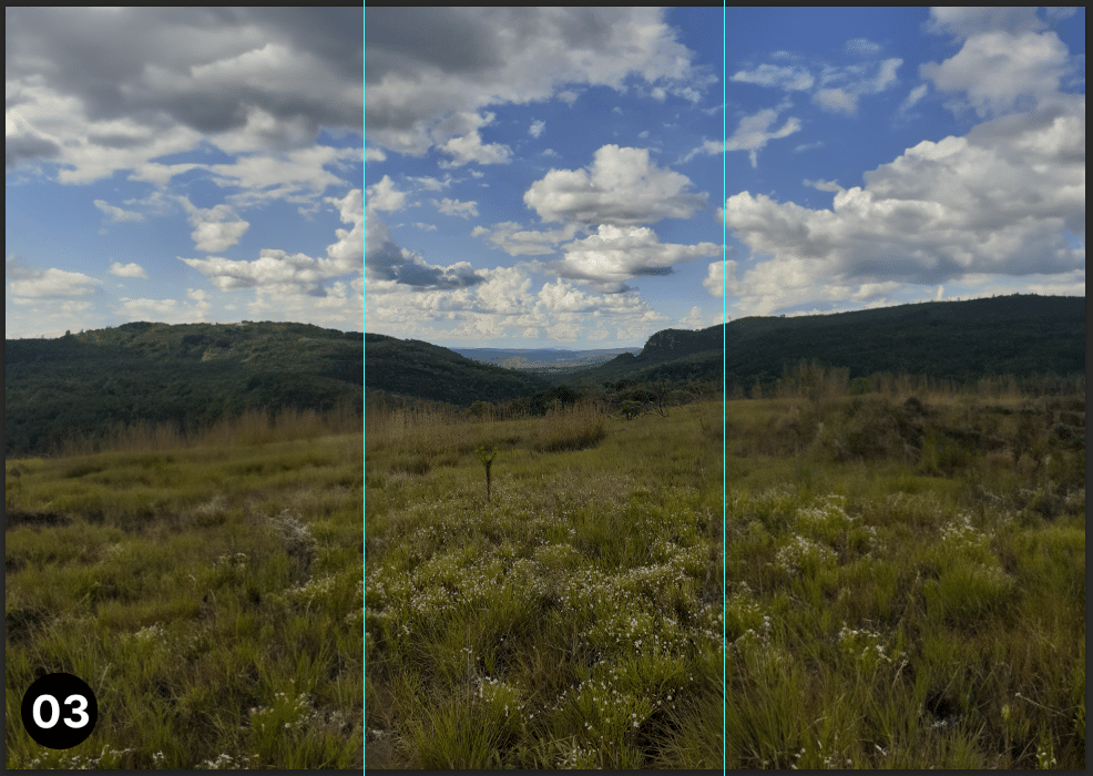 Below we can see this resource in action: 01 is the original image taken with the cellphone camera and 02 is the landscape image generated with the help of Generative Fill. 03 shows exactly where the points of expansion are.