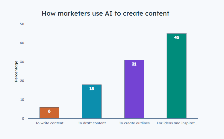 Only a small percentage of people trust AI to completely write their content. The largest portion chooses to use AI technology to build an easier method for writing, drafting, getting ideas, and creating outlines.