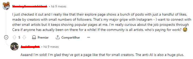 In one of Reddit’s threads, a user stated: “I just checked it out and I really like that their explore page shows a bunch of posts with just a handful of likes, made by creators with small numbers of followers. […] I’m really curious about the job prospects through Cara. […] If the community is all artists, who’s paying for work?”