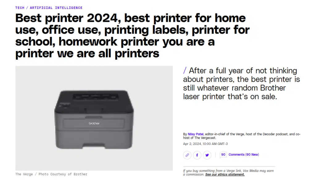 During this major Google update, The Verge caught attention with a peculiar article titled “Best Printer 2024,” which was essentially a prank to test Google’s search algorithm. In short, they wanted to see how far domain authority alone could carry them in search rankings.