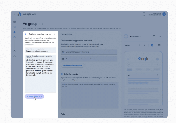 All you need to do is input your landing page into the tool and Google Ads AI will automatically generate relevant and effective keywords, titles, descriptions, images and other assets to perfect your campaign.