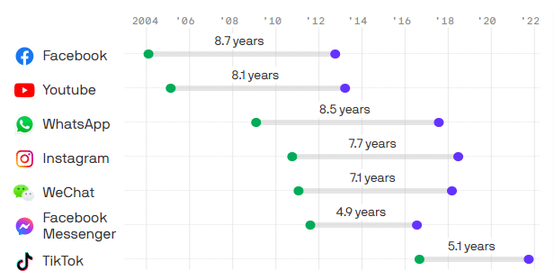 What makes TikTok even more impressive is the speed of growth. As we see in the graph below, it took almost nine years for Facebook to achieve 1 billion users; for Instagram, almost eight years; for TikTok, just five years.
