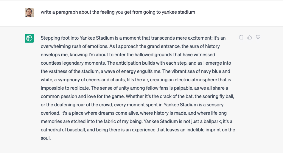 For example, baseball is very nostalgic for me. It was a big part of my childhood and my relationships with important people in my life. The simple act of going to a baseball game is very meaningful to me. I can impart that experience and that meaning to others. AI can’t do that. And when we ask it to, we get a very shallow attempt at actually fostering a real sense of experience and meaning.