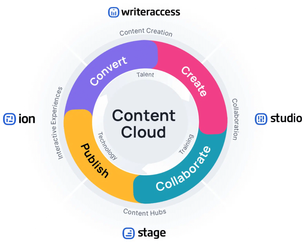 With the new logo, we aimed to communicate to the market that WriterAccess is now an integral part of Rock Content’s suite of products. To ensure product coherence with other Content Cloud solutions (Ion, Studio, and Stage), WriterAccess’s green gave way to Rock Content’s blue. Typography and the icon were also updated, providing cohesion across all our products.