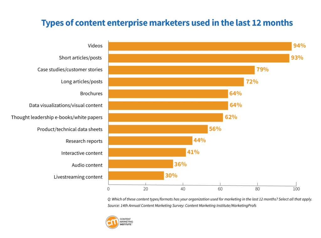 For instance, did you know that 94% of enterprise marketers used video in 2025? According to a Content Marketing Institute (CMI) survey, this was the second most used content type following short articles/posts.