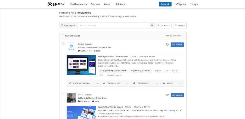 Guru is another freelance marketplace that is used by a more niche audience than larger platforms. It helps you find talented freelancers at a low cost and provides a wide range of professional services, including content creators, IT professionals, and software developers. However, it has an interface that customers find difficult to manage.